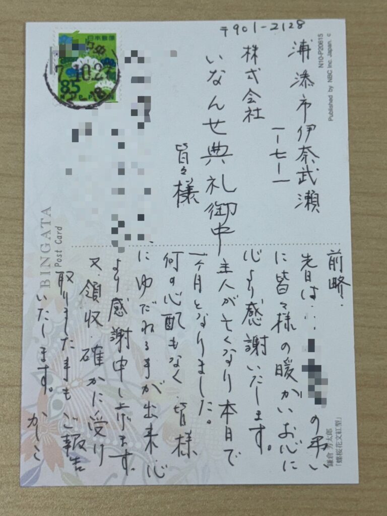 先日ご葬儀をお手伝いさせて頂いたご家族様からいなんせ典礼宛にお礼のお葉書を頂きました。